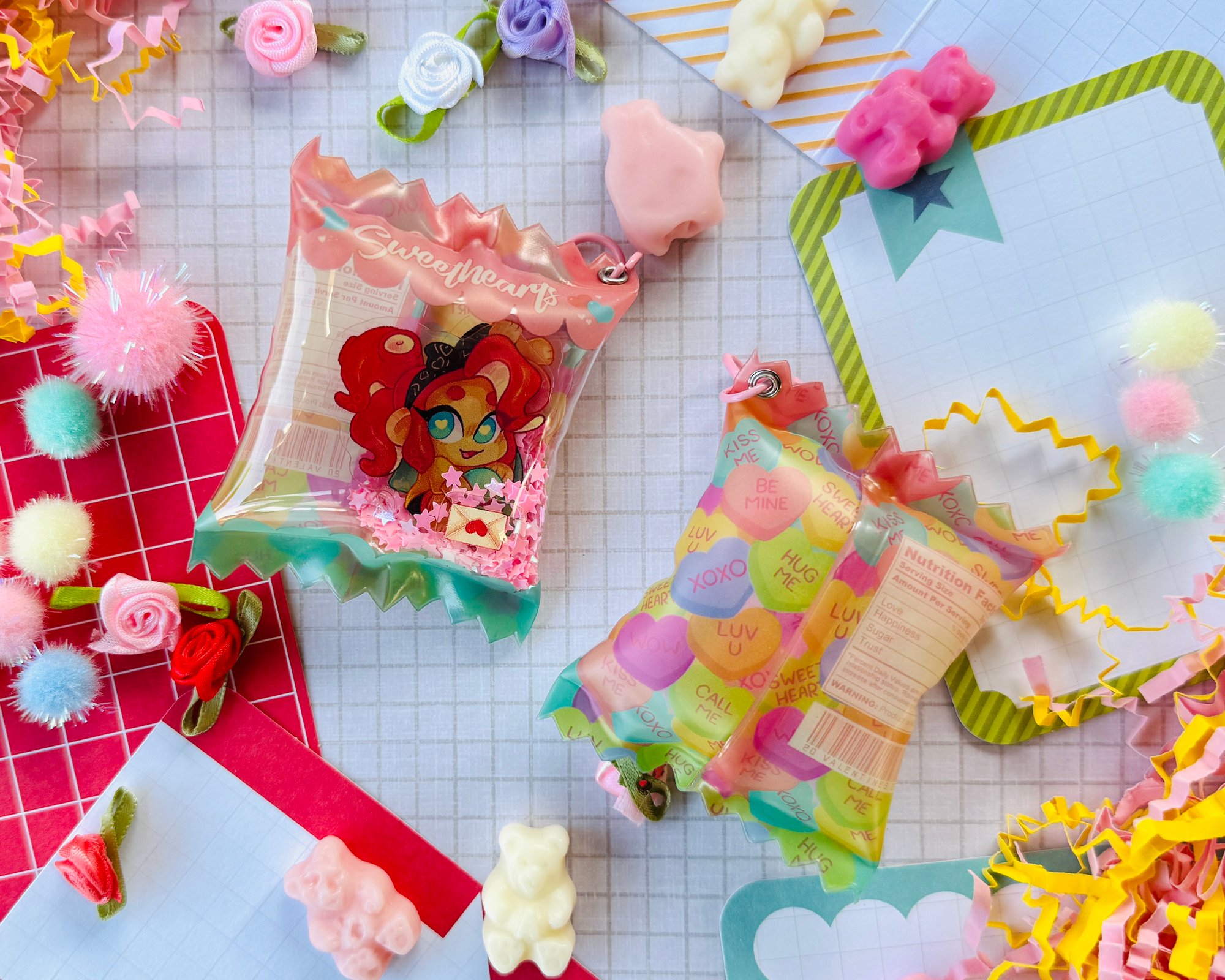 Got a Splatoon sweetheart in your life? Grab a pack of Sugar Squids! This puffy candy charm features a red octoling and blue inkling, submerged in pink star-shaped confetti.